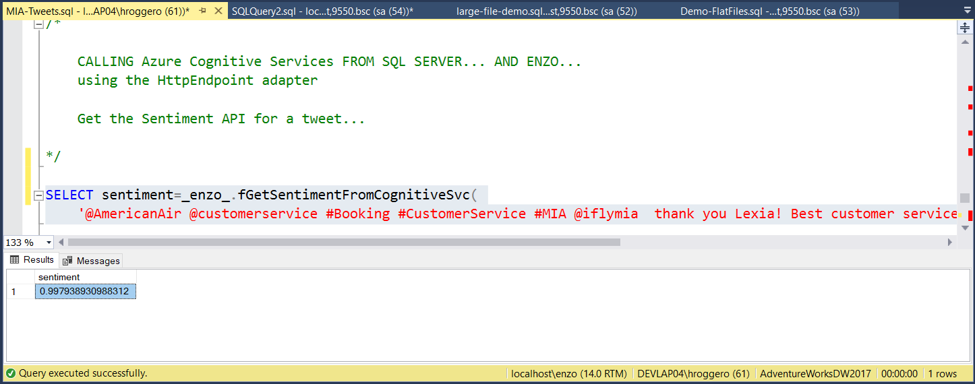 This looks like a negative comment; as we can see the score is 0.02, which is very low. Once you call this command, Enzo connects to the Cognitive Service, sends the payload, and returns the JSON result to SQL Server in real-time.
