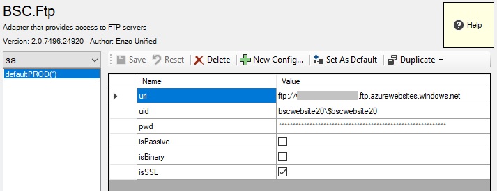 The name of the FTP configuration setting is called defaultPROD in this example; note that the (*)