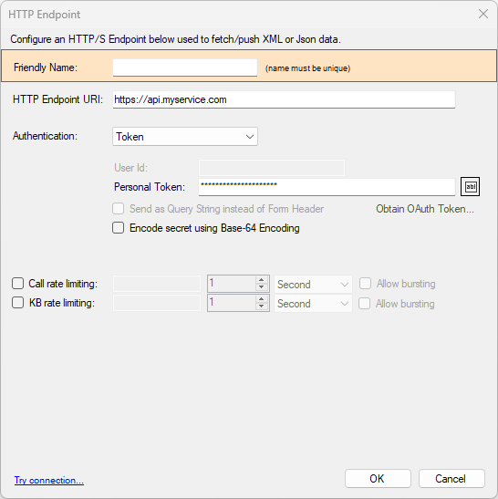 For HTTP/S Services that use Bearer authentication, choose Bearer. Bearer authentication can be complex to setup but is considered more secure. Most services require a Bearer Token; some also use Refresh Tokens to generate new Bearer Tokens over time.