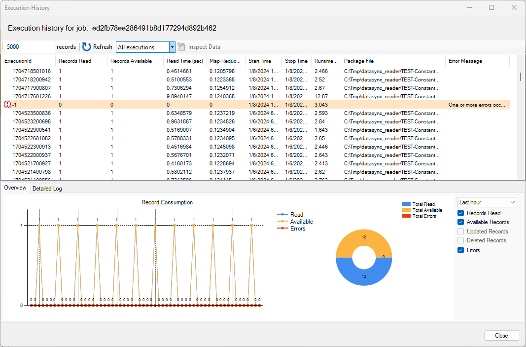 You can change the filters to view all job executions, relevant executions (successful with records available and errors), or only the executions that failed. You can also modify the number of records returned (a positive number must be specified).