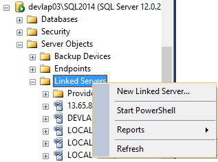 To create a new Linked Server from an existing SQL Server instance, expand Server Objects->Linked Servers, right-click and choose New Linked Server.